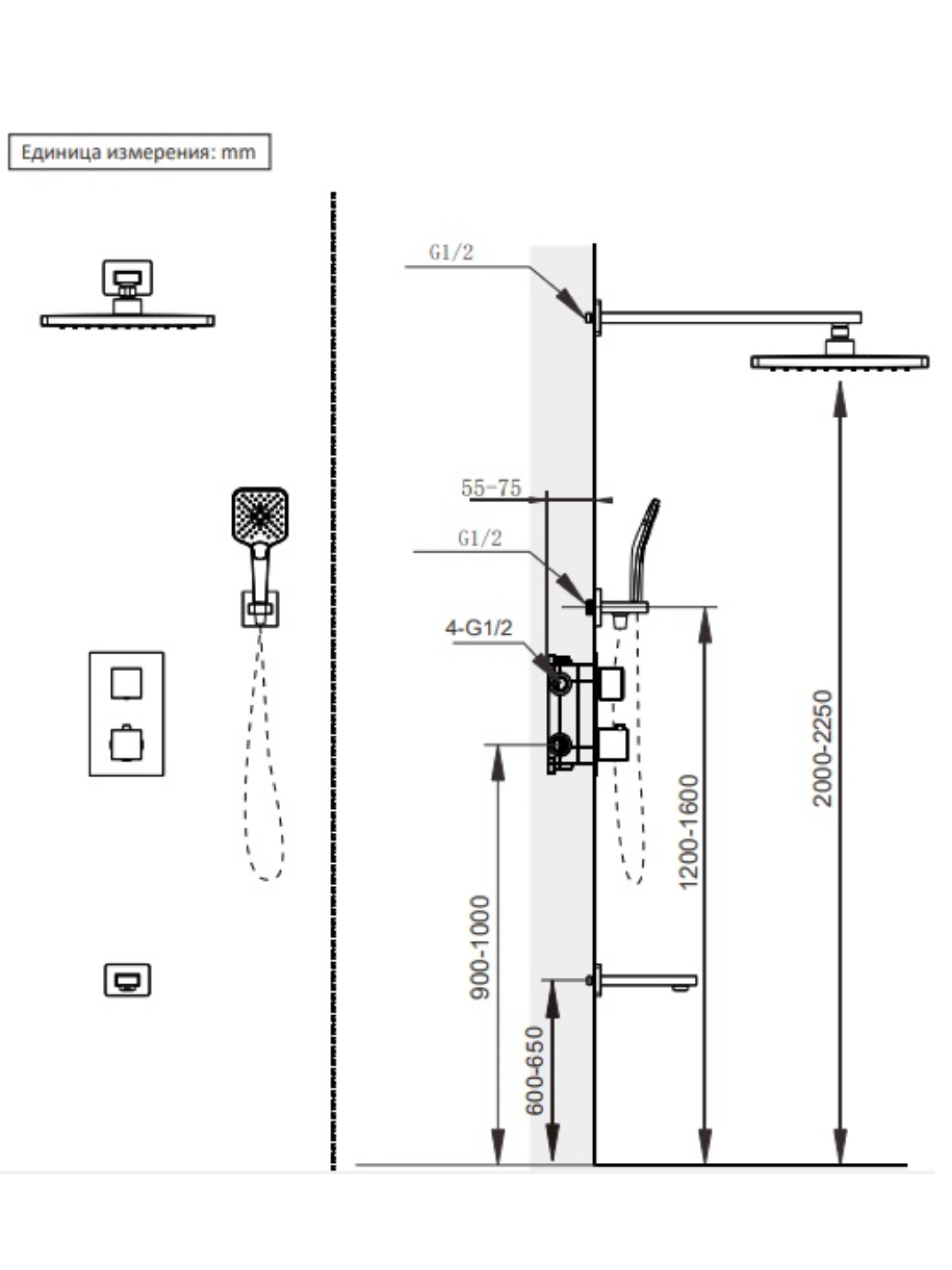 Комплектация: встраиваемая часть, термостатический смеситель, штуцер/держатель ручного душа, двухрежимный ручной душ, гибкий полимерный шланг, верхний душ, излив, аэратор