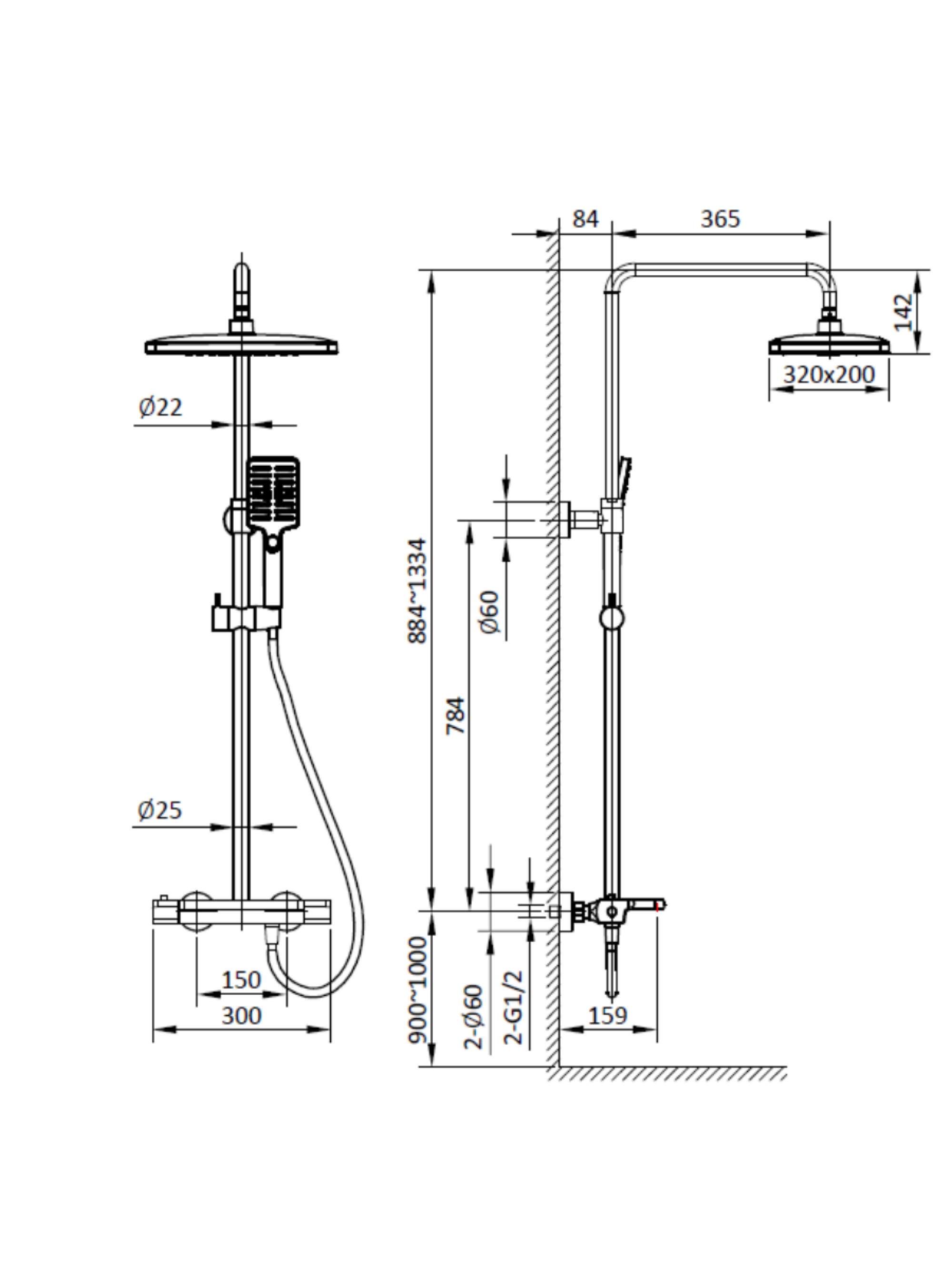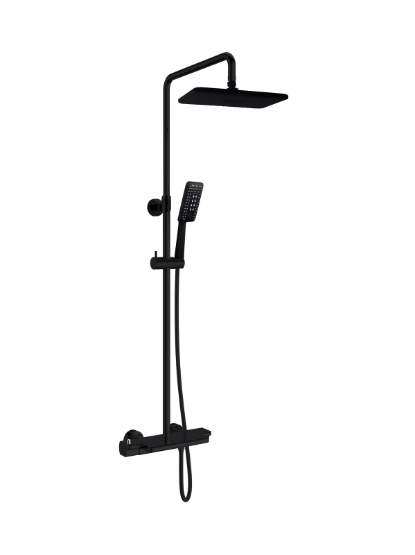 Комплектация: термостатический смеситель, телескопическая штанга с держателем для ручного душа, ручной душ, гибкий полимерный шланг, верхний душ, аэратор эксцентрики, декоративные чаши