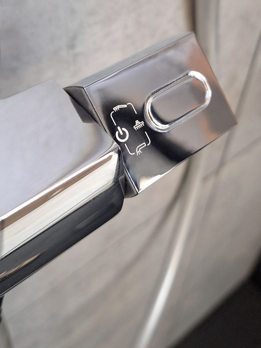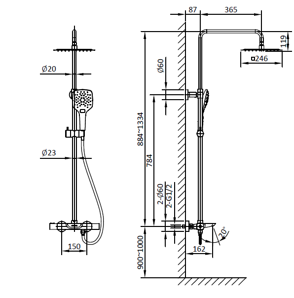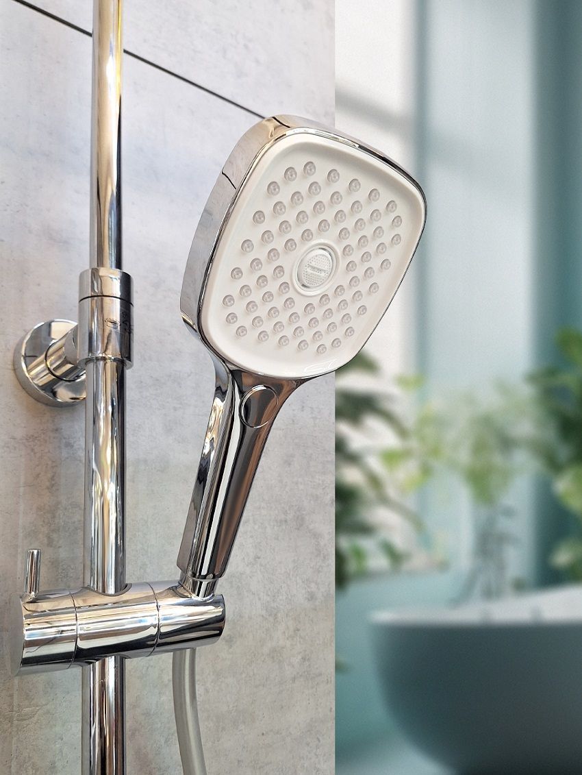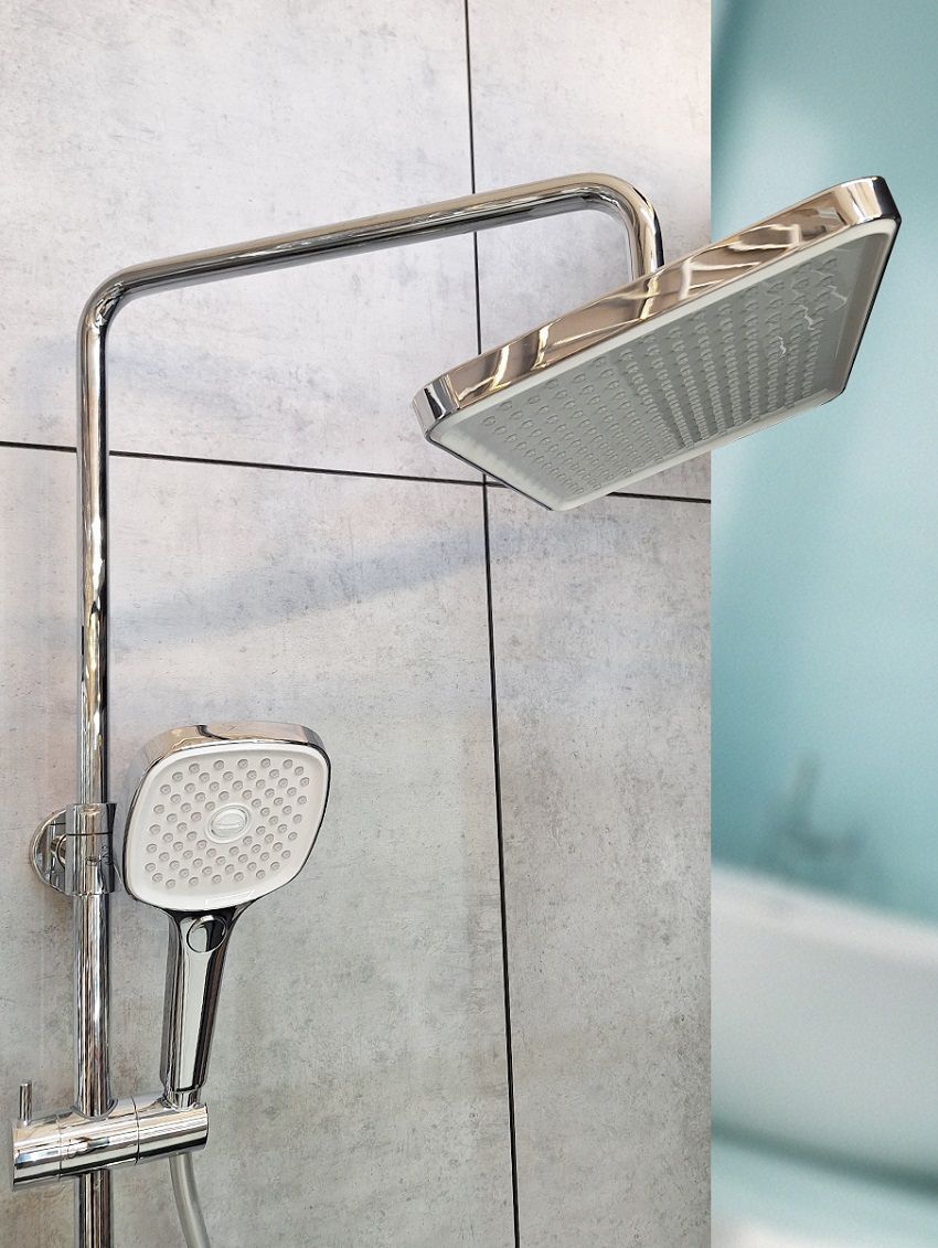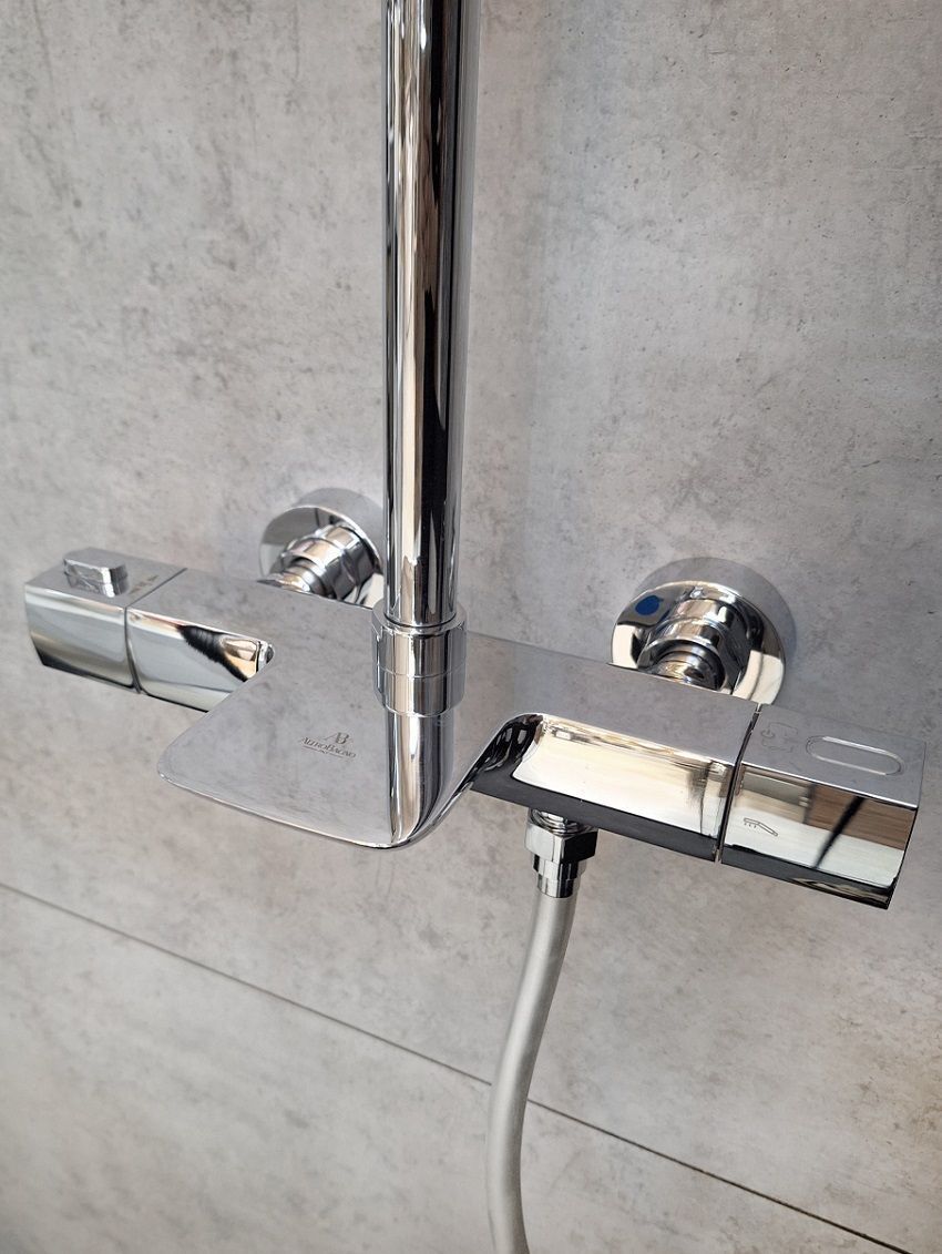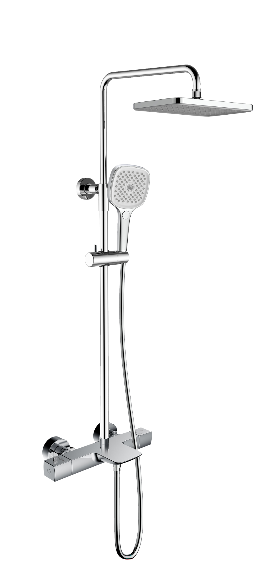 Комплектация: термостатический смеситель, телескопическая штанга с держателем для ручного душа, ручной душ, гибкий полимерный шланг, верхний душ, аэратор, эксцентрики, чаши декоративные