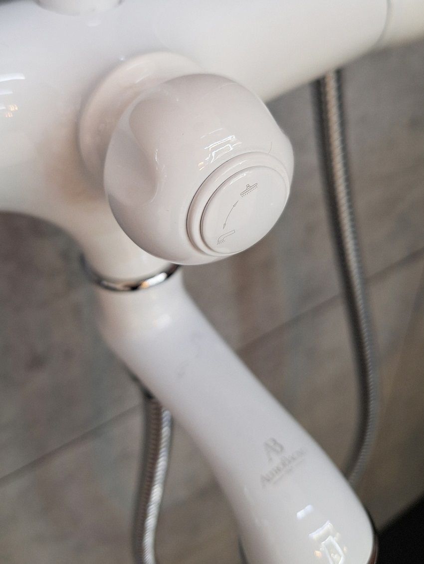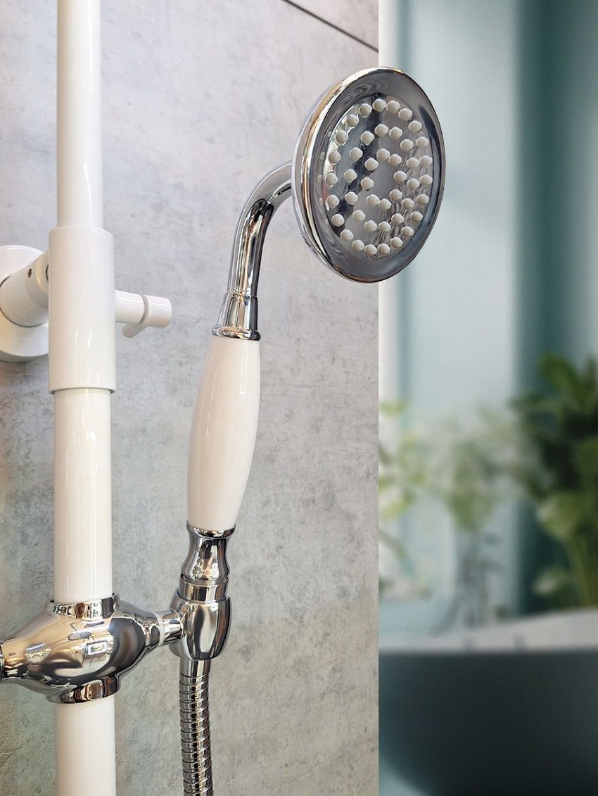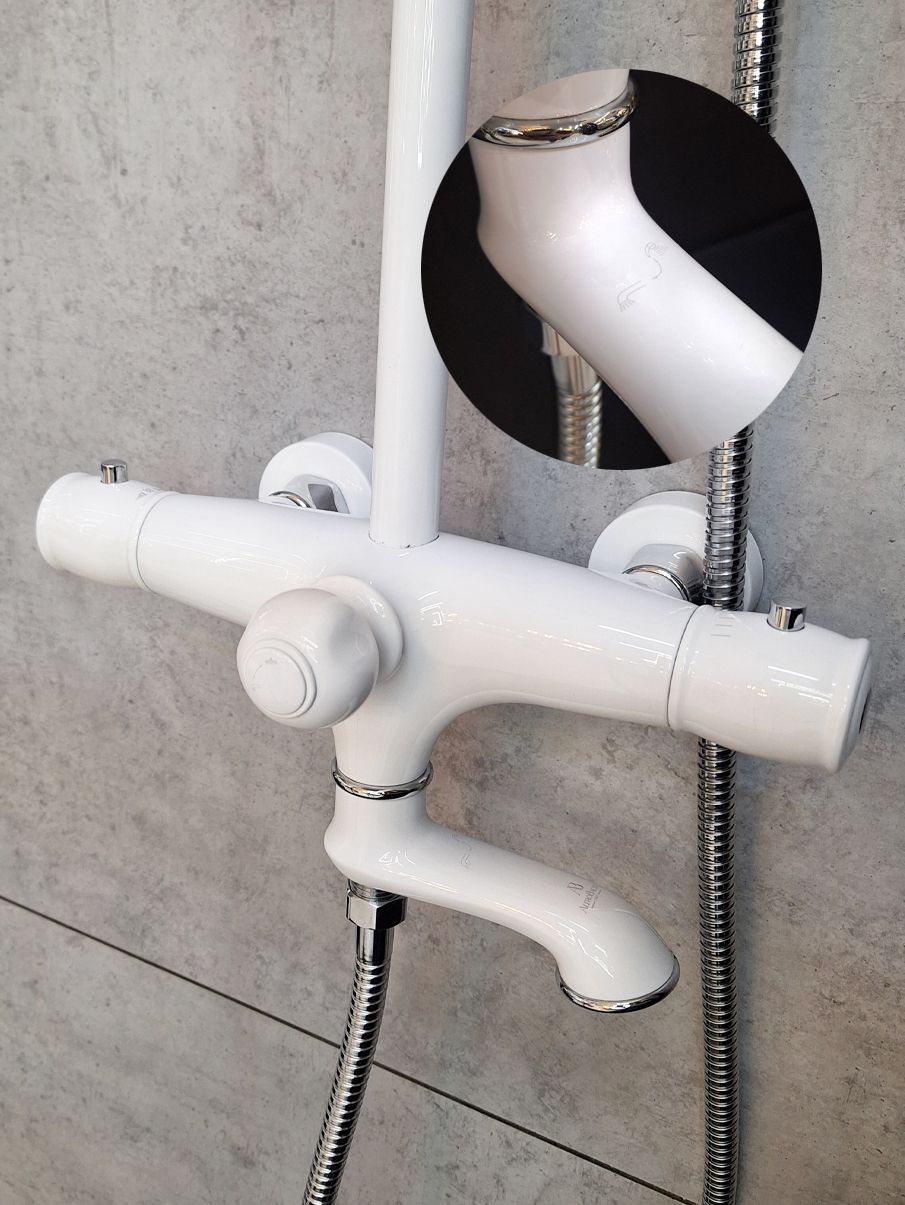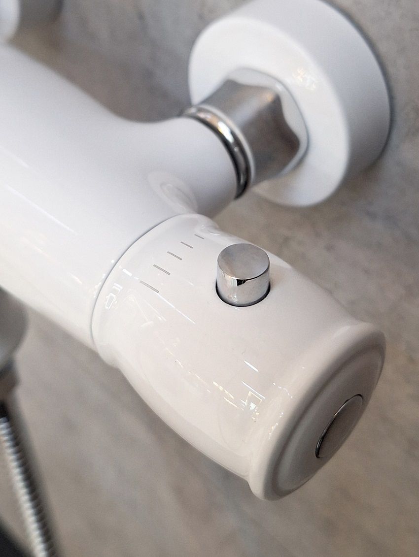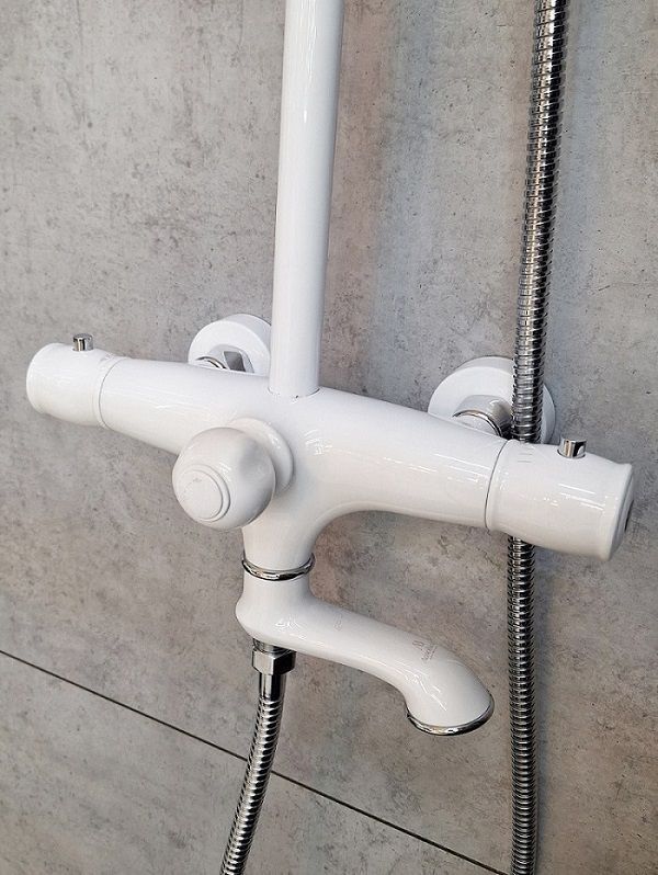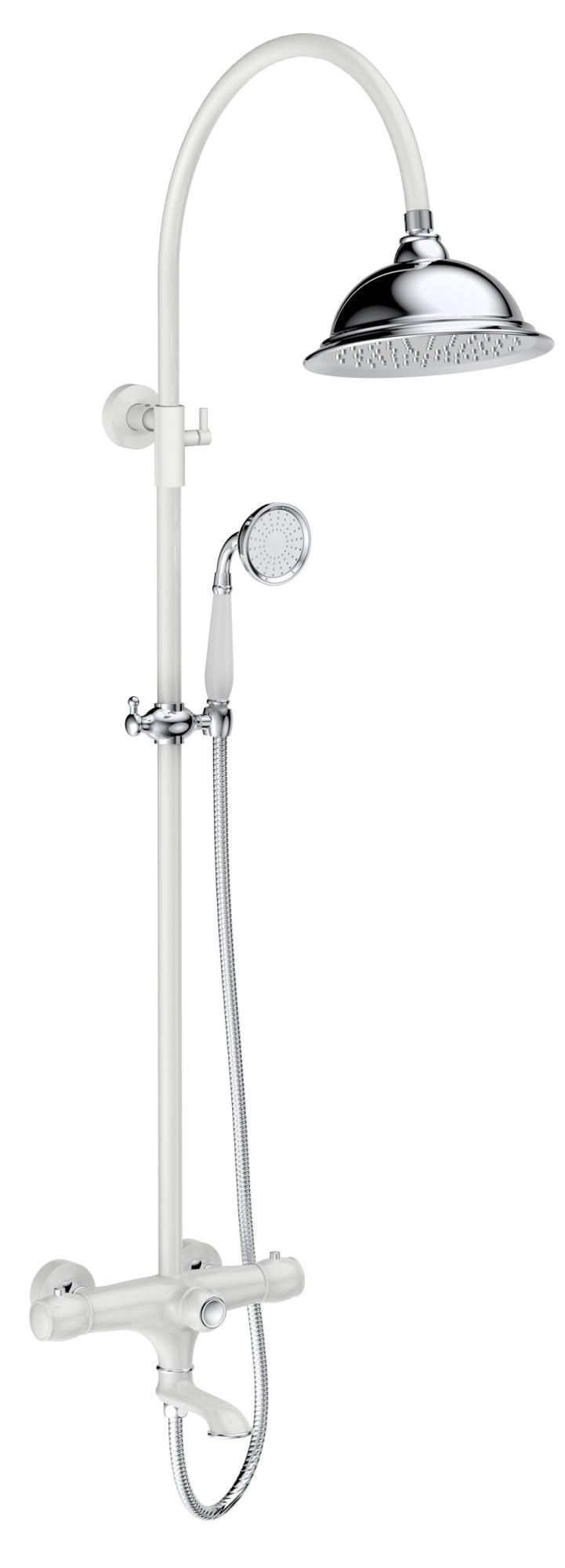 Комплектация: термостатический смеситель, телескопическая штанга с держателем для ручного душа, ручной душ, гибкий металлический шланг, латунный верхний душ, аэратор, эксцентрики, чаши декоративные