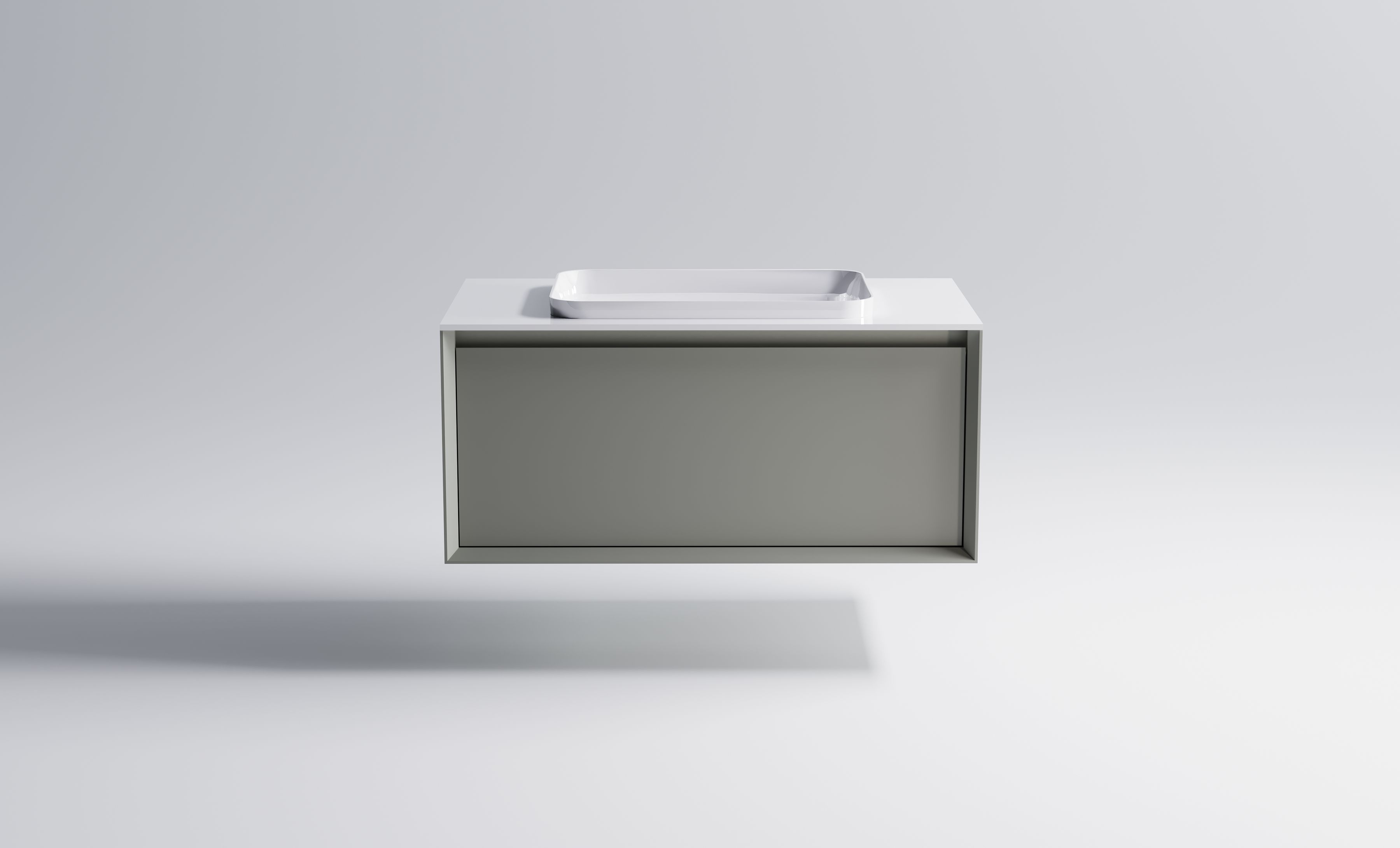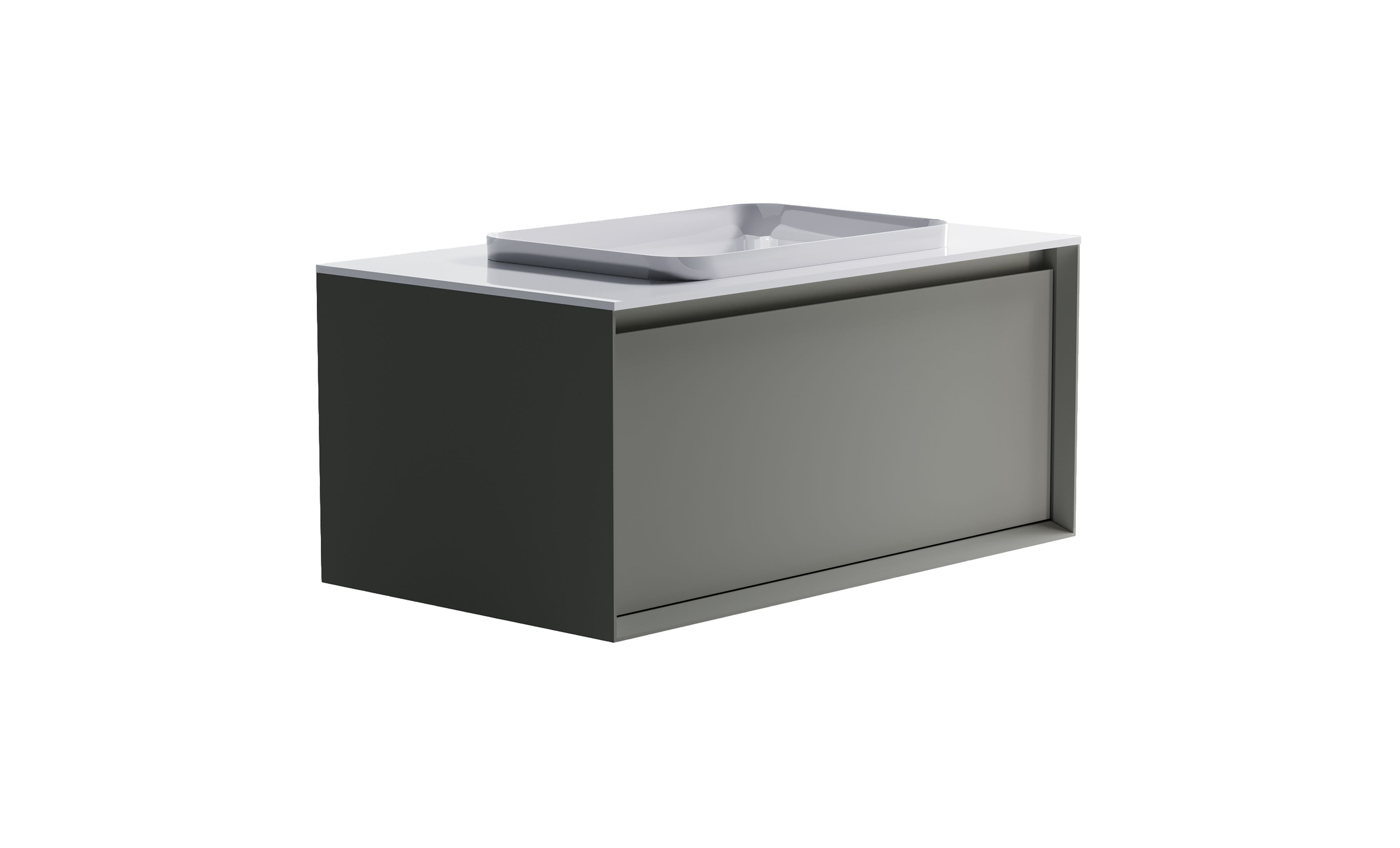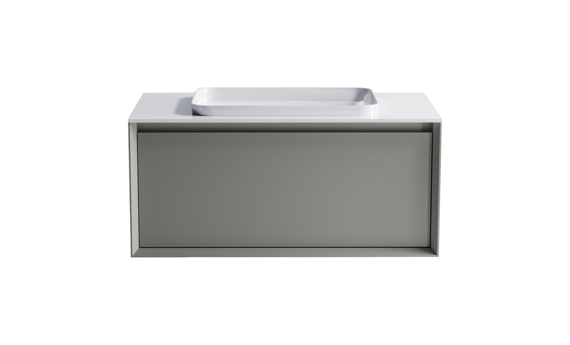Комплектация: Нижний Шкаф Фрейм 900 с 1 ящиком серо-бежевый (NCS S 3502-y матовый) + Столешница "Фрейм" 900 мм+ Раковина "Антарес" 55х38 (30мм над уровнем столешницы)