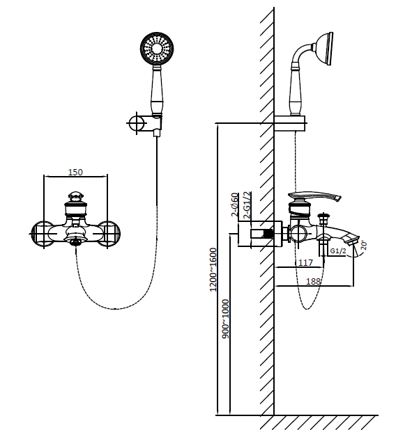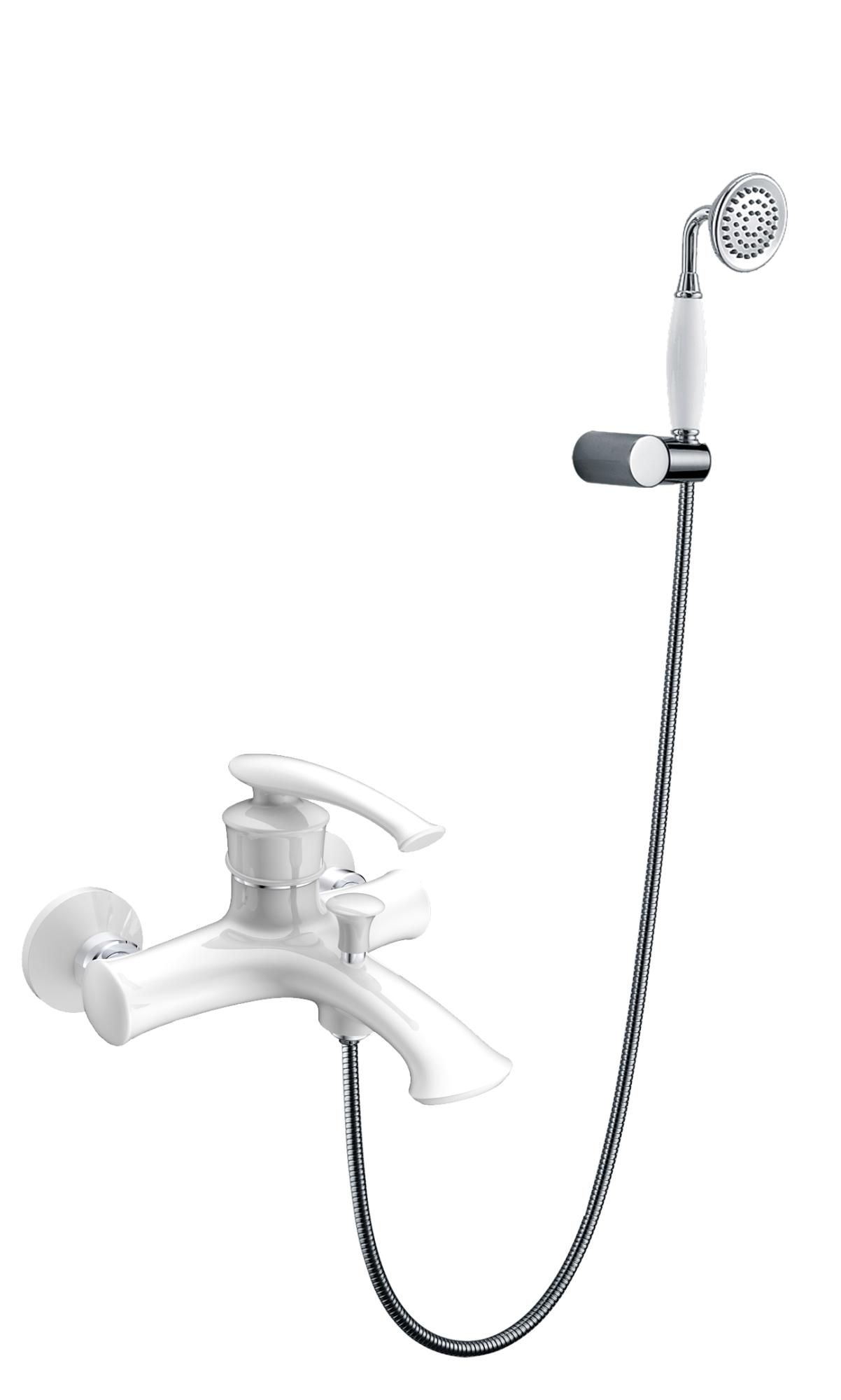 Комплектация: смеситель настенного монтажа, настенный держатель ручного душа, латунный ручной душ, гибкий металлический шланг, аэратор, эксцентрики, чаши декоративные